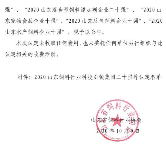 2020 山東飼料添加劑(發(fā)酵類)企業(yè)十強(qiáng)