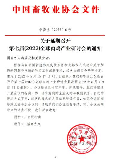根據(jù)當(dāng)前全國新冠肺炎疫情形勢和成都市人民政府關(guān)于加強(qiáng)新冠肺炎疫情的防控工作部署要求,經(jīng)大會組委會研究決定,原定于2022年5月15-17日(15日報(bào)到)在成都市渝江飯店召開的第七屆(2022)全球肉雞產(chǎn)業(yè)研討會延期至2022年8月7-9月(7日報(bào)到),會議地點(diǎn)及內(nèi)容不變,詳見附件。我們將繼續(xù)開展會議的招商工作,請有意向的企業(yè)及時(shí)與我們聯(lián)系。