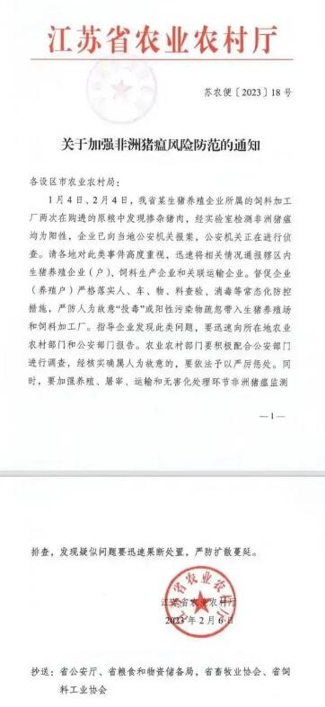 通知稱,1月4日、2月4日,江蘇省某生豬養(yǎng)殖企業(yè)所屬的飼料加工廠兩次在購(gòu)進(jìn)的原糧中發(fā)現(xiàn)摻雜豬肉,經(jīng)實(shí)驗(yàn)室檢測(cè)非洲豬瘟均為陽性,企業(yè)已向當(dāng)?shù)毓矙C(jī)關(guān)報(bào)案,公安機(jī)關(guān)正在進(jìn)行偵查。