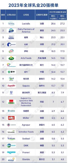 從這份榜單中發(fā)現(xiàn):法國乳業(yè)巨頭Lactalis(蘭特黎斯)連續(xù)三年(2021-2023)蟬聯(lián)全球乳業(yè)第一;美國奶農(nóng)直接從2022年的第四名躍居2023年的全球第二;去年排名第二的雀巢下滑至2023年全球乳業(yè)第三;達(dá)能則從去年第三下滑到2023年的全球第四。